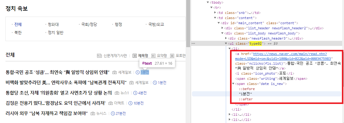 네이버 정치 속보 페이지에서 어떤 클래스를 이용해 뉴스 정보를 어떻게 불러올지 소스 분석으로 알아봄