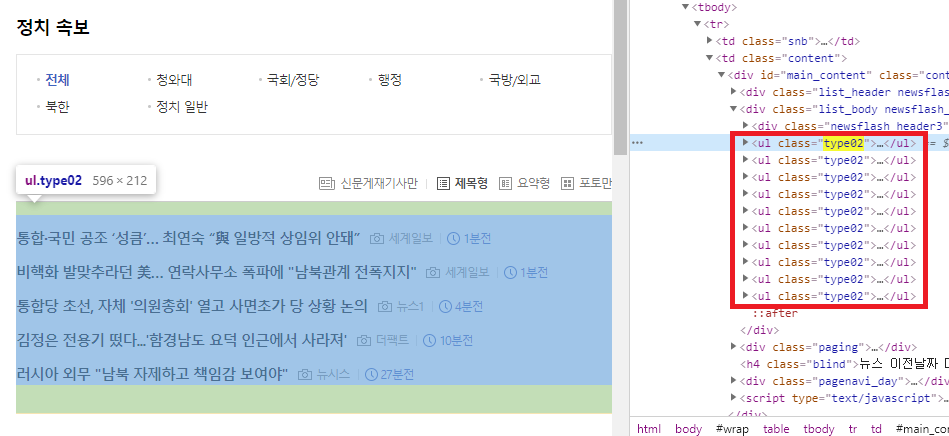 네이버 뉴스는 'type02' 클래스 안에 5개의 뉴스가 있고, 'type02'는 10개가 존재함
