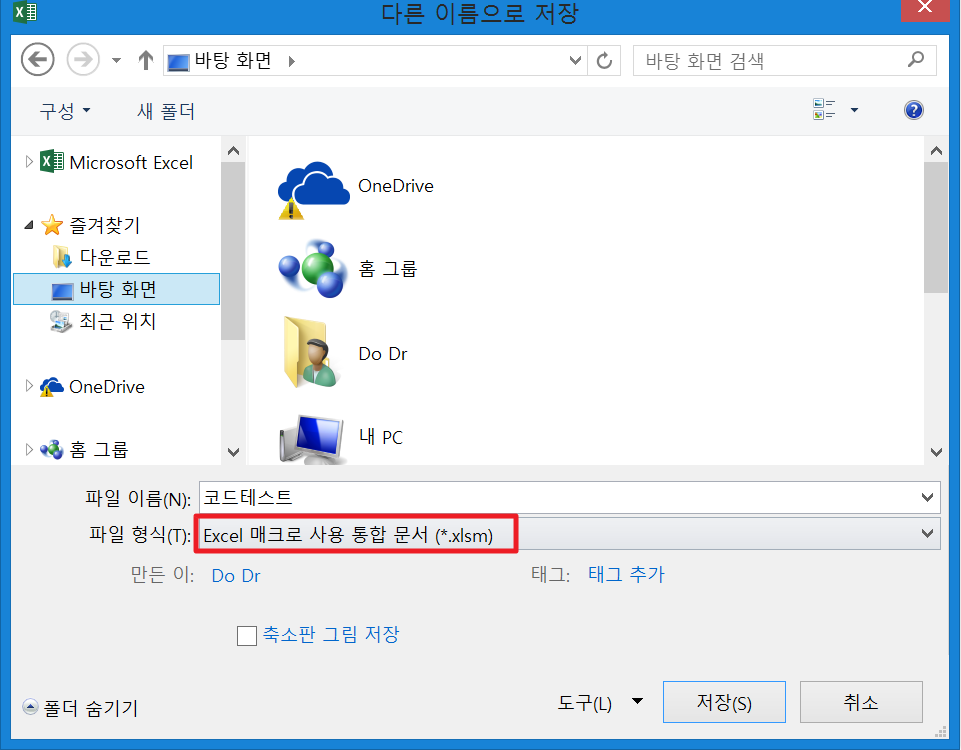 - 편집창을 닫고 다른이름으로 저장을 누른다. 저장 할 때 .xlsm 확장자로 해야 코드가 사라지지 않는다.