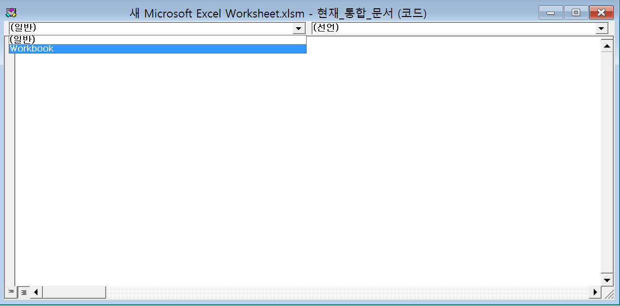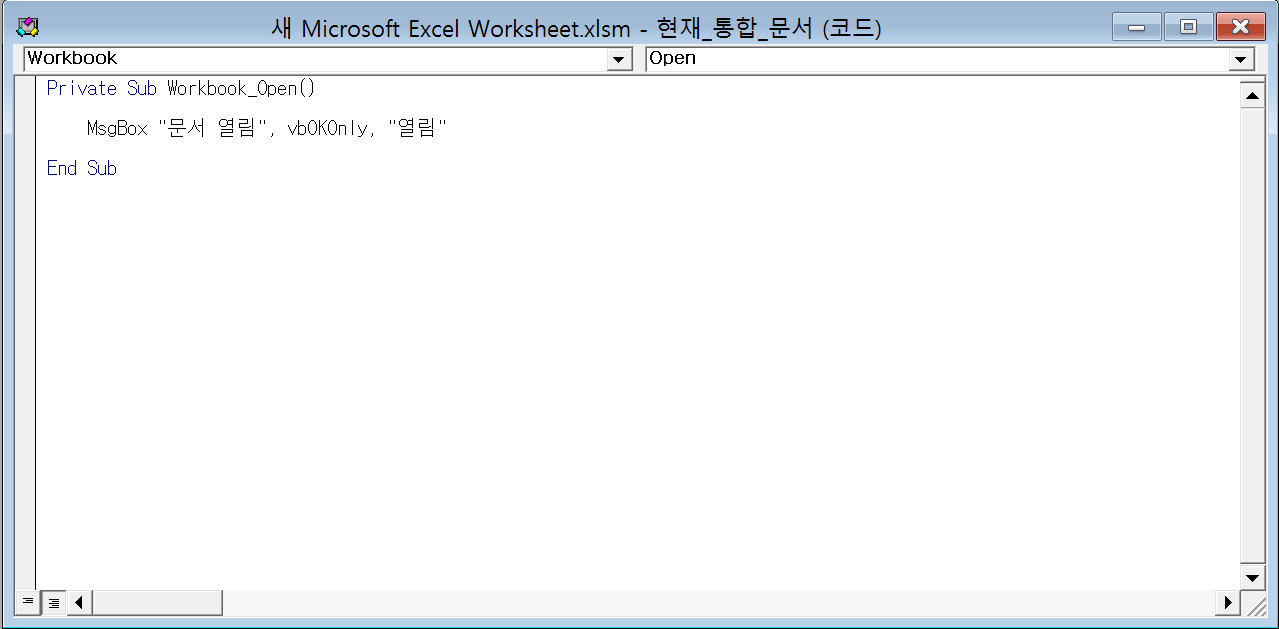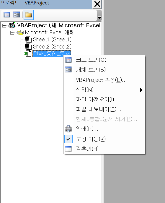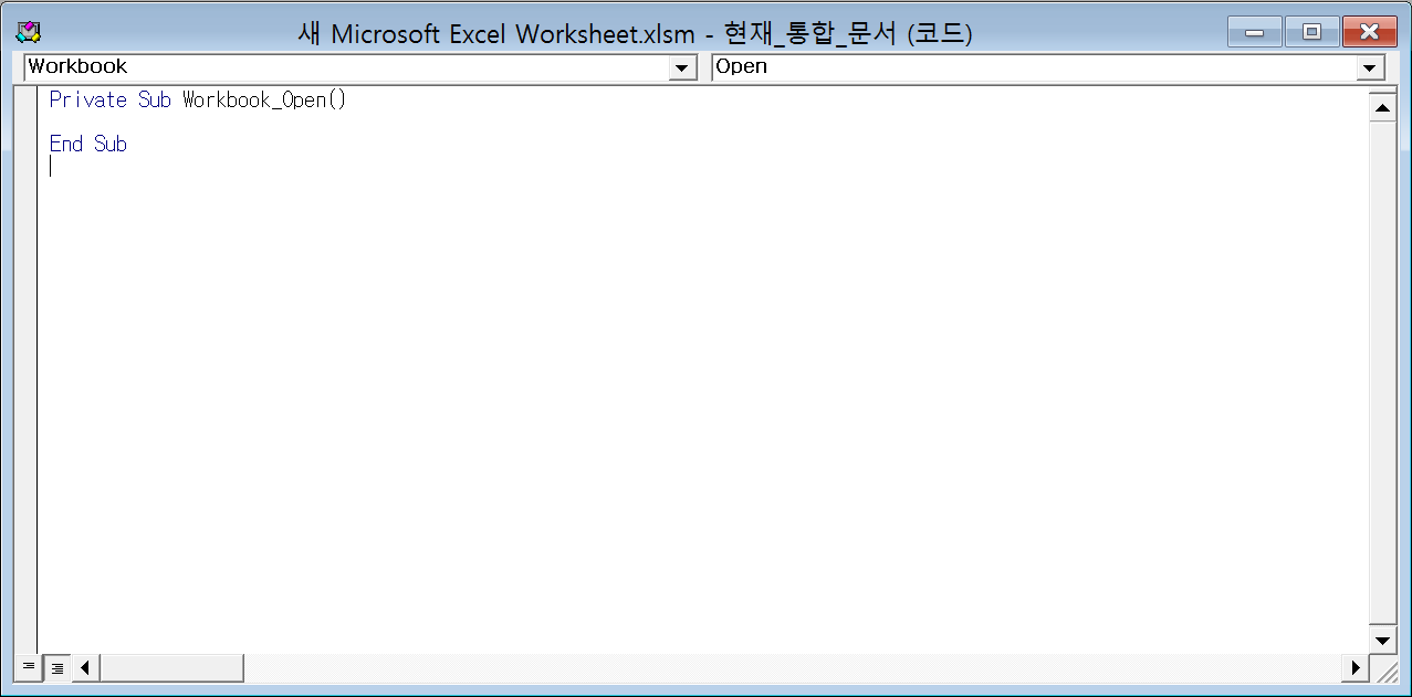 - 엑셀vba 편집기 > 프로젝트 창 > Microsoft Excel 개체 > 현재_통합_문서 더블 클릭 또는 우클릭 후 코드 보기