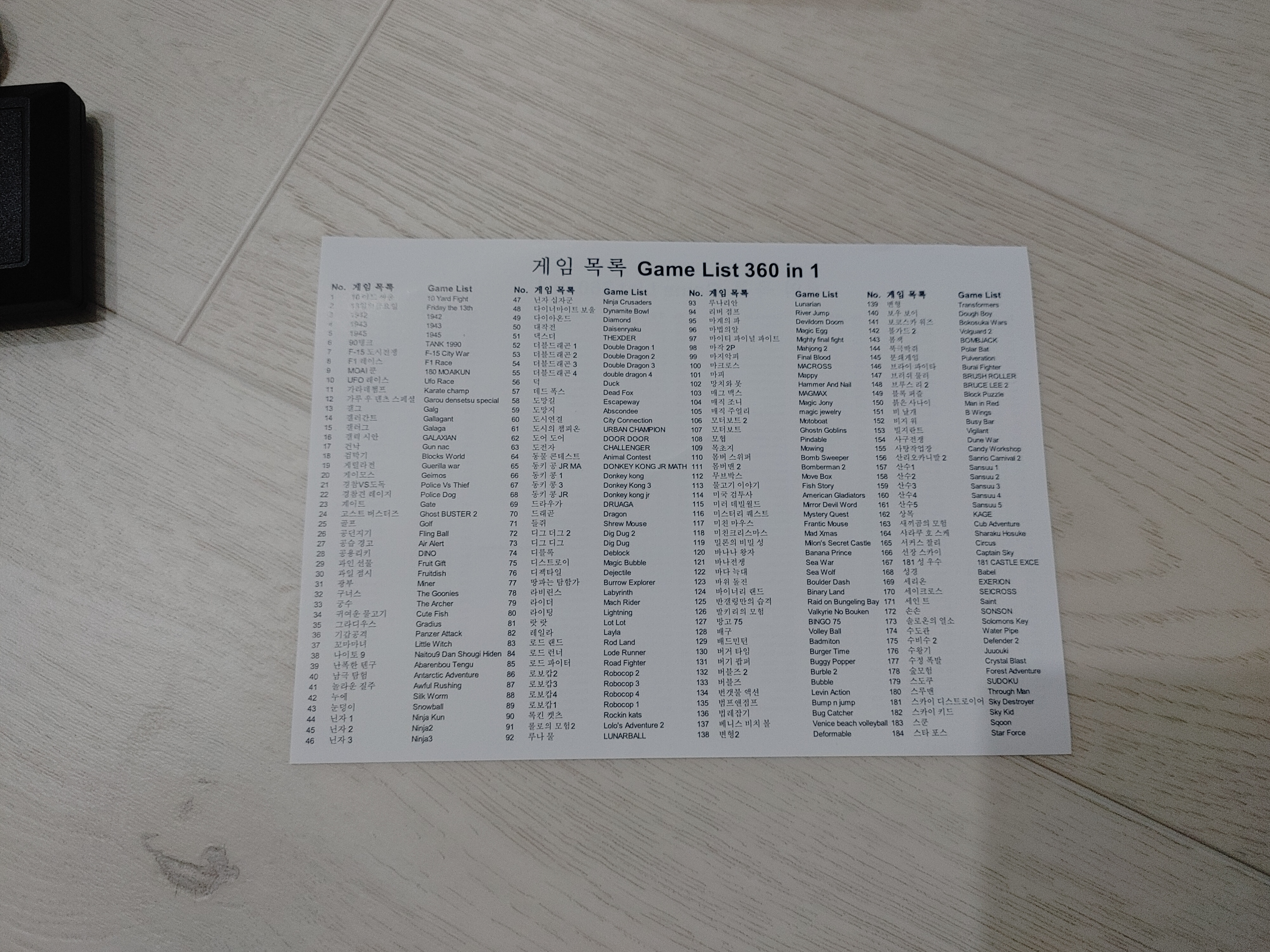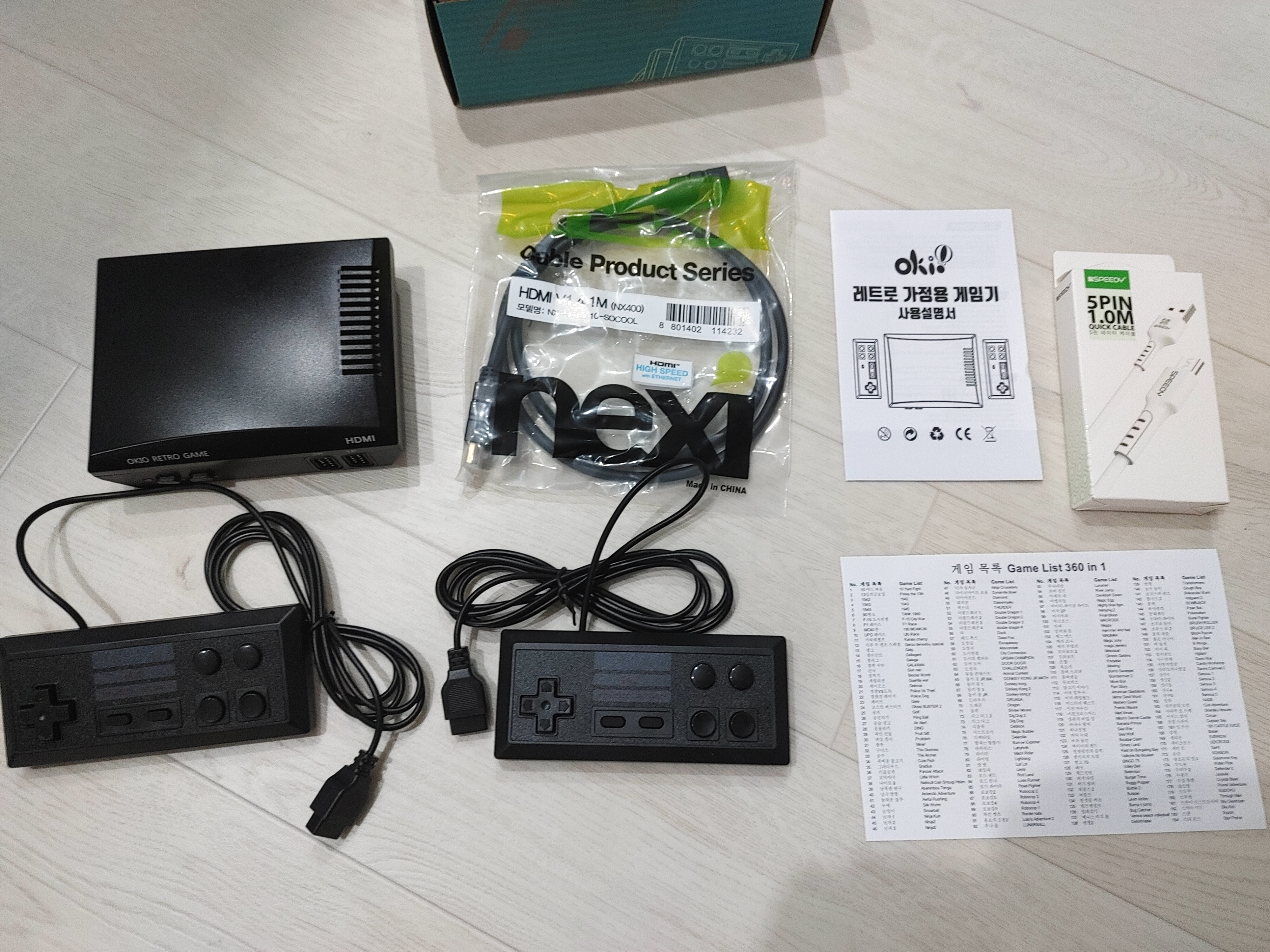 - 본체, 조작기 2개, HDMI 케이블 1M, 5pin 1M, 사용설명서, 게임목록