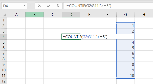 예시2) G1 ~ G11 범위에서 5 이상의 값은 몇 개인가?