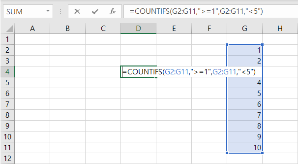 예시1) G1 ~ G11 범위에서 1이상 5미만의 값은 몇 개인가?