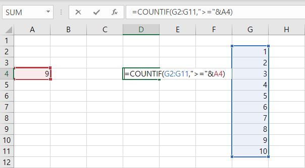 예시3) G1 ~ G11 범위와 A3의 숫자를 참조하여 9 이상의 값을 찾아보자.