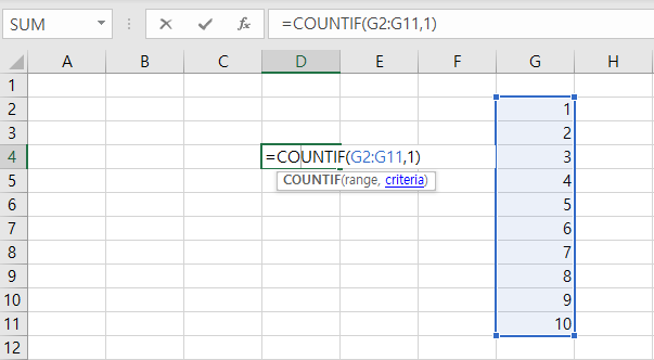 예시1) G1 ~ G11 범위에서 1의 값이 몇 개인가?