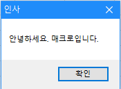 MsgBox "안녕하세요. 매크로입니다.", vbOKOnly, "인사"