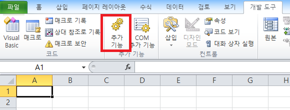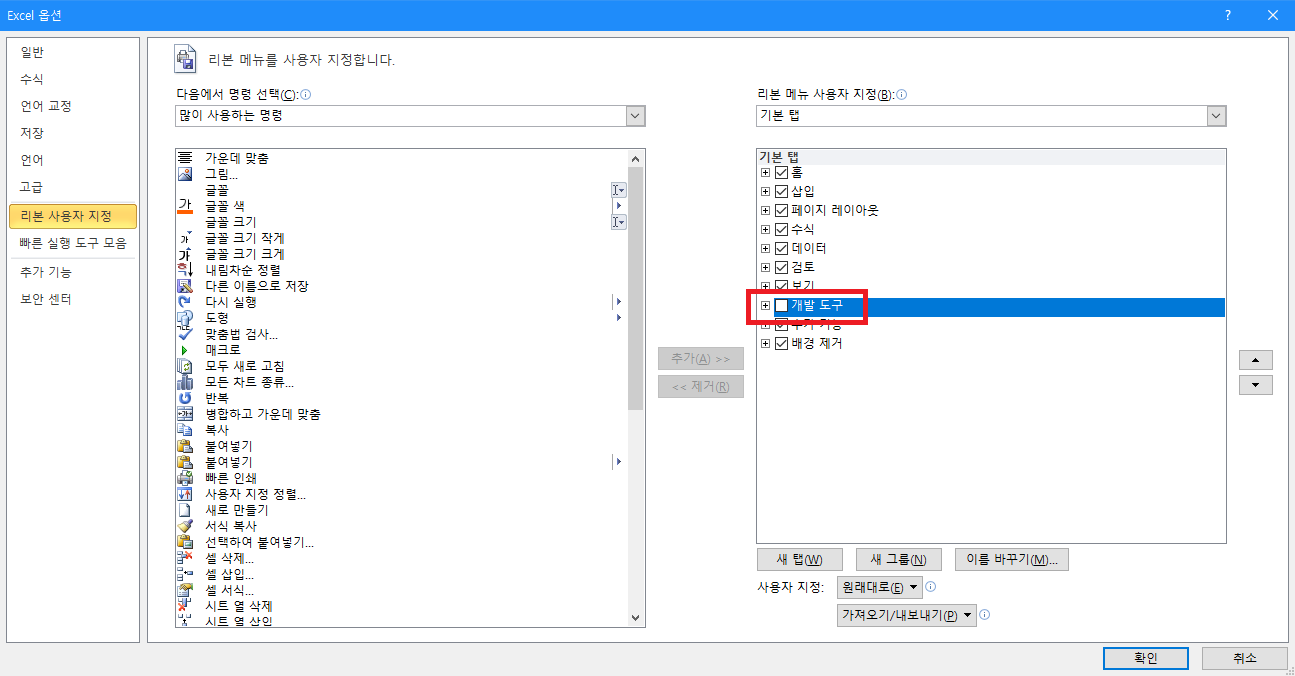 엑셀 옵션 > 리본 사용자 지정 > 기본 탭에서 개발 도구 항목 체크를 해주면 나타나게된다.