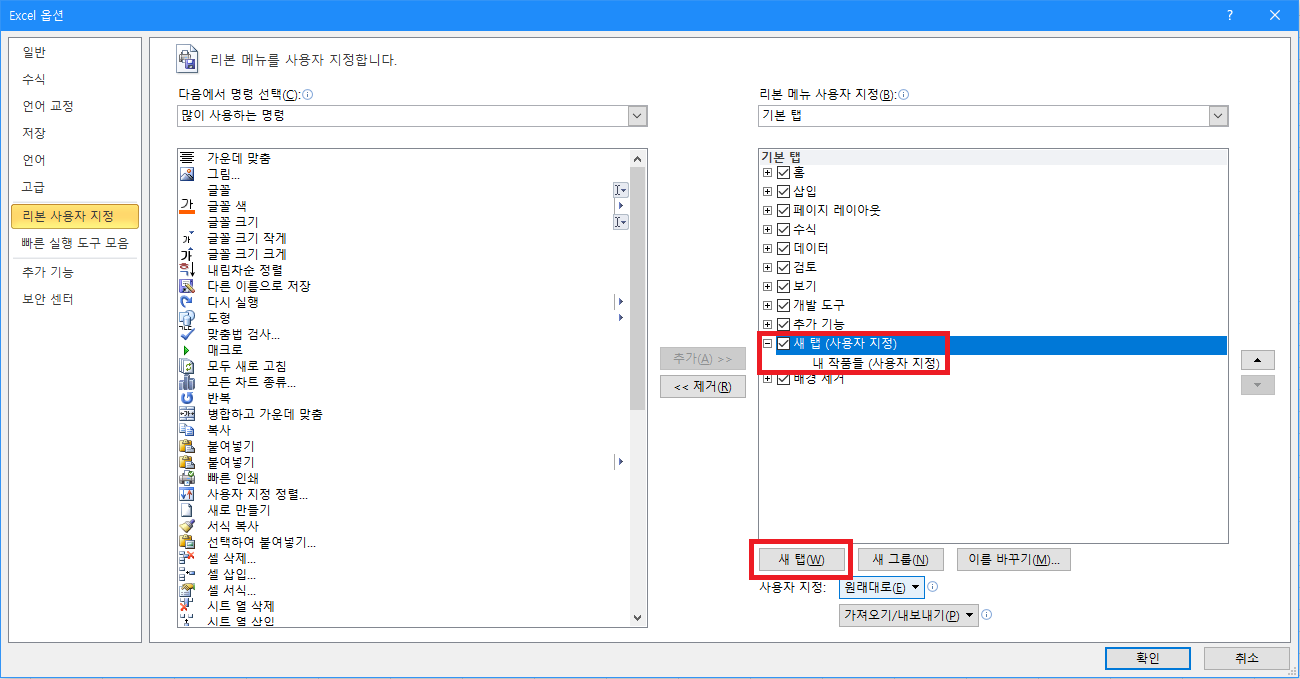 엑셀 옵션 > 리본 사용자 지정으로 들어간다.