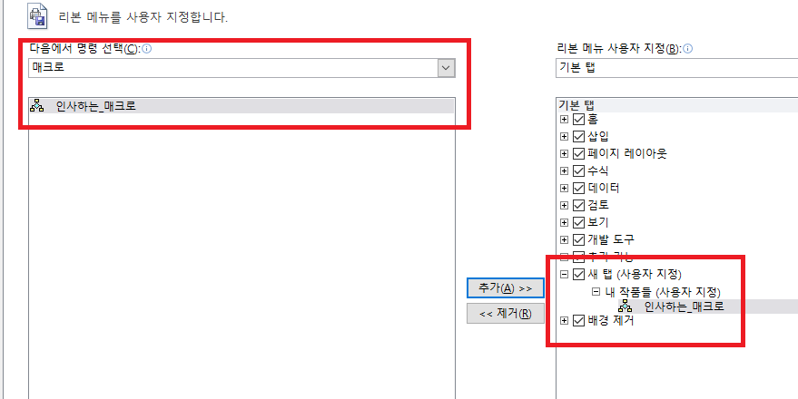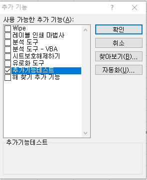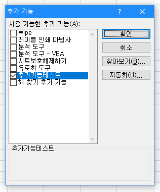 다음에서 명령 선택 > 매크로 선택하면 내가 넣어놓은 추가기능이 보인다.