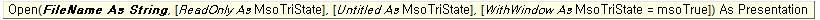 vba로 파워포인트를 열 때 open 함수가 엑셀과 많이 다르다.