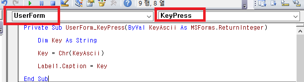 사용자 정의 폼에서 아무 키를 누르면 아스키코드의 10진수로 UserForm_KeyPress에 전달된다.