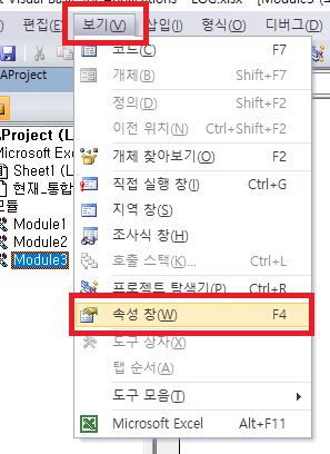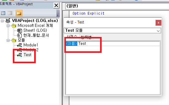 VBA의 속성 창으로 모듈의 이름을 변경할 수 있다.
