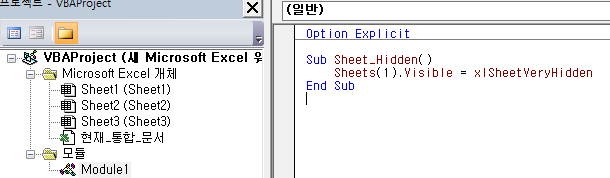 vb편집기에 봐도 시트는 그대로 있지만 엑셀화면에서는 시트를 찾아볼 수 없다.