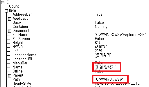 인터넷 익스플로러를 열지 않은 상태이지만 Item1로 데이터가 들어가 있음을 확인했다.