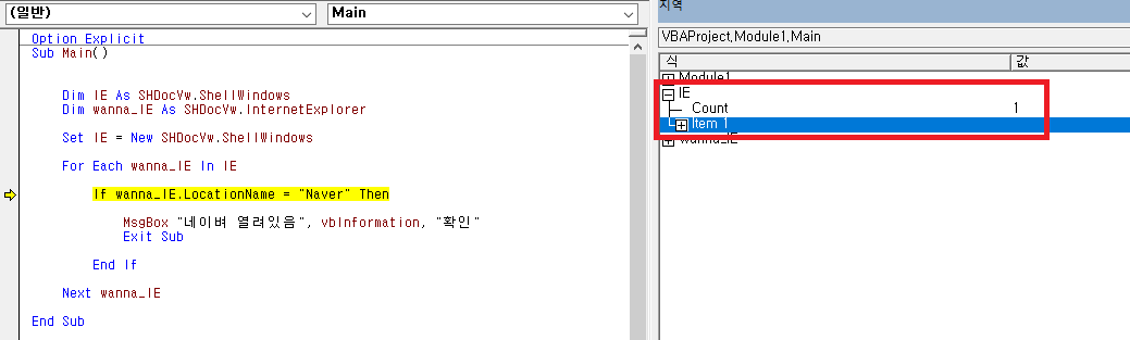 열려있는 익스플로러 중에 네이버라는 이름을 가진 창이 있으면 메세지 박스를 표시하고 함수를 종료하는 코드.