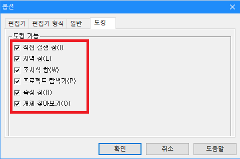 vba편집기의 '도구 > 옵션 > 도킹 탭'에서 쉽게 해제 할 수 있다.