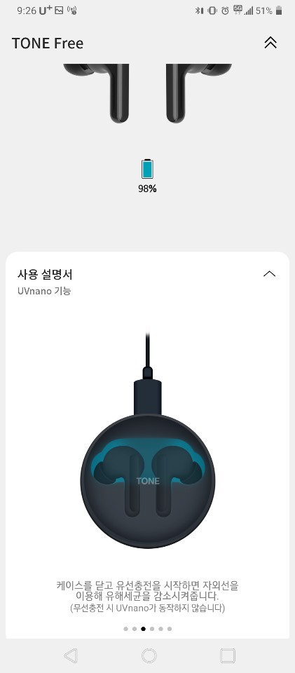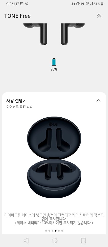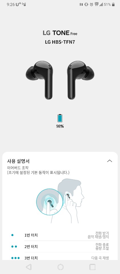첫화면의 상단에서 볼 수 있는 내용들은 TONE Free 왼쪽 오른족 터치 횟수에 따른 기능, 배터리 잔량, 기타 기능들에 대한 설명이다.