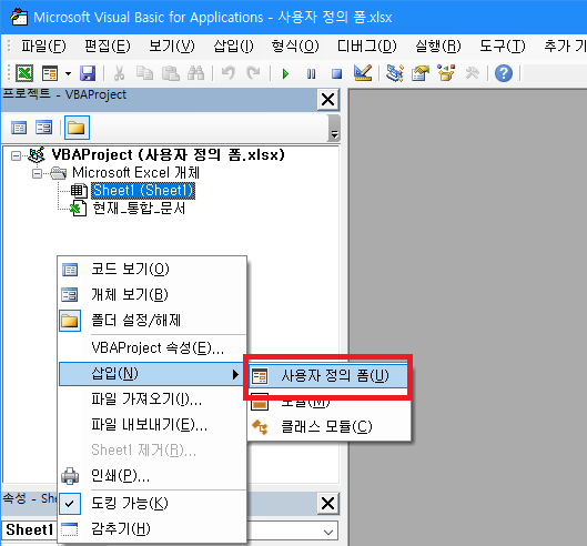 그리고 프로젝트 창에서 마우스 우클릭하여 사용자 정의 폼을 추가한다.