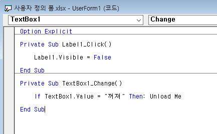텍스트 상자의 Change 이벤트를 이용하여 값이 '꺼져'이면 폼이 닫히도록 코드를 작성했다.