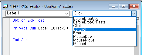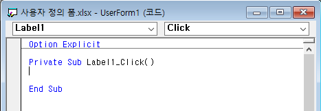 코드보기를 누르면 위와 같은 화면을 볼 수 있다. 대충 프로시저 이름(Label1_Click)만 보더라도 어떨때 코드가 동작하는지 알 수 있다.