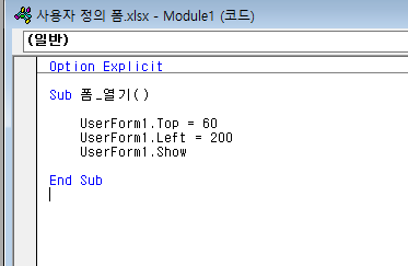 * UserForm1.Top = 60 폼의 상하 위치 조절. 0에 가까울수록 위로 올라감. 즉, 위쪽 끝의 값은 0