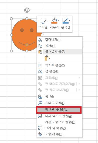 필자는 '웃는 상'이라는 도형을 클릭하면 모듈1이 실행되도록 설정할 것이다.