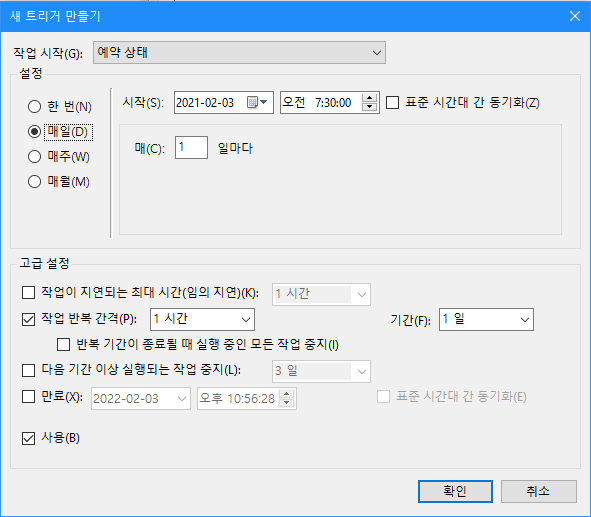 요기까지하고 확인 누르면 작업 스케줄러 설정은 끝이다.