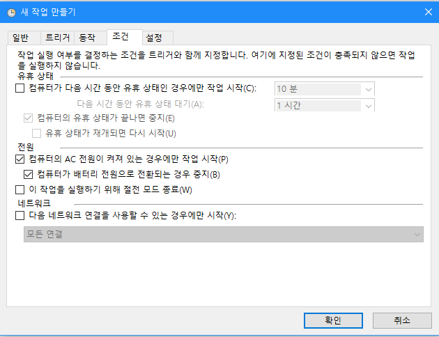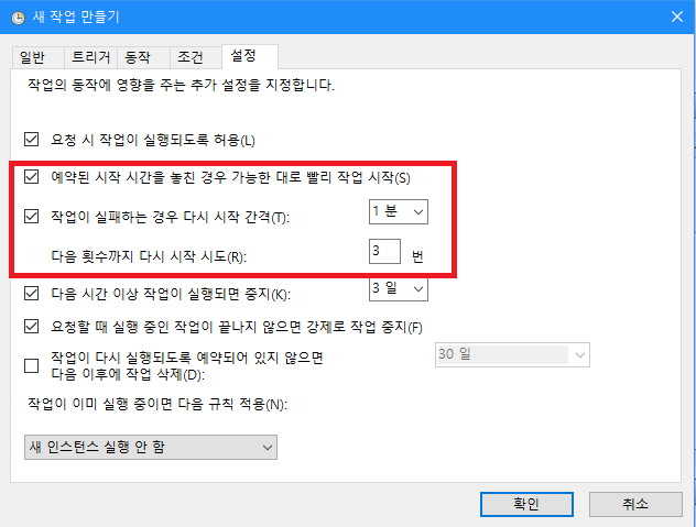 조건이 맞을 때 원하는 프로그램이 시작할 수 있게 위 그림처럼 설정한다. 그리고 설정 탭으로 이동한다.