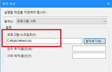 아까 만들어둔 작업 스케줄러에서 동작 부분의 프로그램을 teset.vbs로 바꾸면 1분마다 CMD 창이 보이는 문제가 해결될 것이다.
