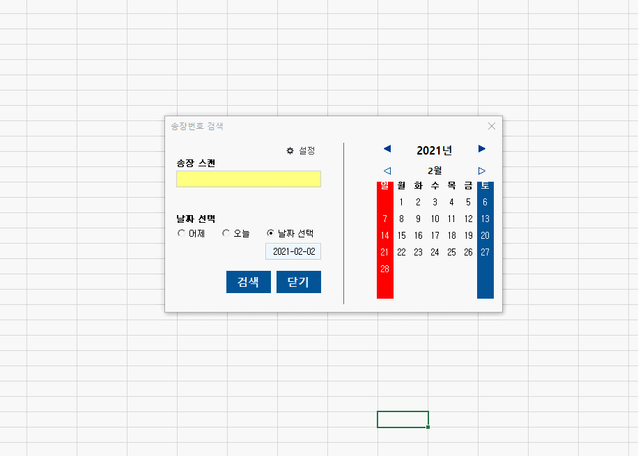 주황색 버튼을 누르면 송장번호 검색 폼이 열린다. 그리고 원하는 날짜를 선택할 수 있도록 기능을 만들었다.