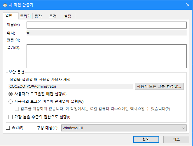 이름(필수)과 설명(선택)을 적고 '가장 높은 수준의 권한으로 실행' 체크하고 트리거 탭으로 넘어간다.