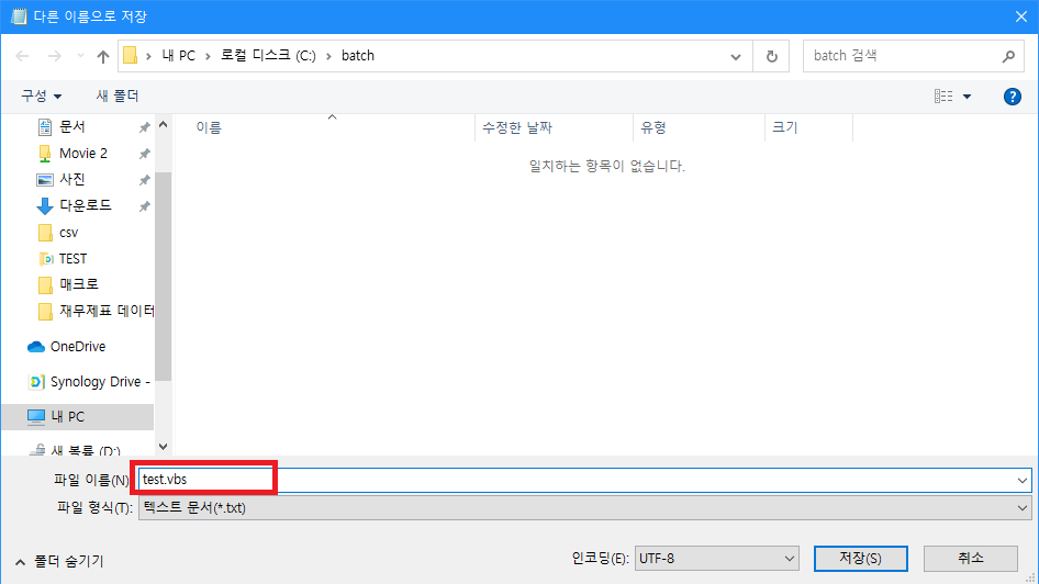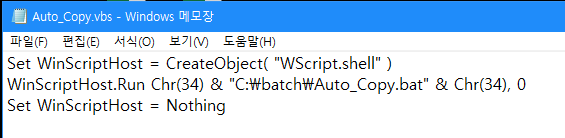 코드의 배치파일경로만 수정해서 저장할때 .vbs로하면 vbs파일로 만들어진다.