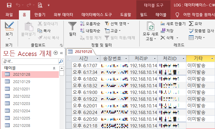테이블은 날짜로 구분하고 필드는 시간, 송장번호, 처리ip, 처리id, 기타 다섯가지 존재한다. 그리고 레코드는 모두 짧은 텍스트 형식으로 저장한다.
