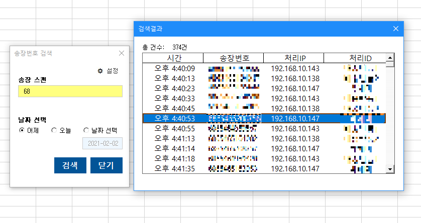 위 그림은 송장번호 68로 검색했을 때 나타나는 검색 결과이다. 로그에는 작업자 ID가 나오지 않는다고 했지만 우리는 자리마다 정해진 계정을 사용하므로 특별한 일이 없다면 99.99% 동일한 계정으로 발송 작업을 처리하게 된다. 그리고 처리 IP는 작업 PC의 내부 IP주소를 나타낸다.
