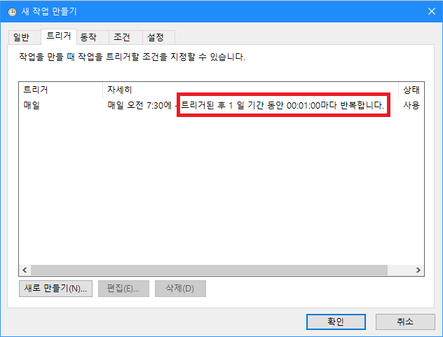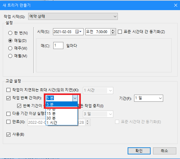 작업 반복 간격을 눌러보면 5분이 가장 짧은 시간처럼 보인다. 하지만 5분을 클릭하고 5를 1로 바꿔주기만 하면 1분마다 실행 할 수 있다.
