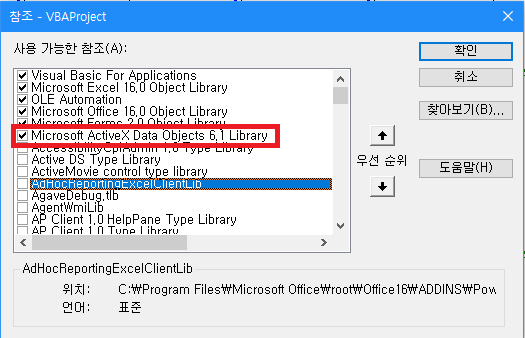 엑셀 -> Alt + F11 -> 도구 -> 참조 -> Microsoft ActiveX Data Object 6.1 Library 체크 후 확인