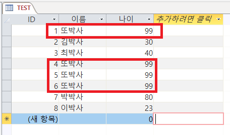 모든 도박사가 99살 또박사가되었다... 레코드 수정할땐 이런 경우를 방지하기 위해 정확한 조건을 넣어주는 것이 좋다 고 한다. 지금은 이름 조건만 있었지만 여기에 ID 값이나 나이 등 정확히 하나의 레코드만 나오도록 식별 할 수 있는게 필요하다. 여기선 고유의 값을 가지고 있는 ID 필드를 이용해 다시 한번 업데이트를 시도해보자.