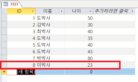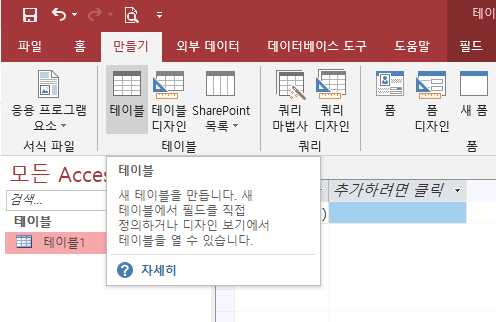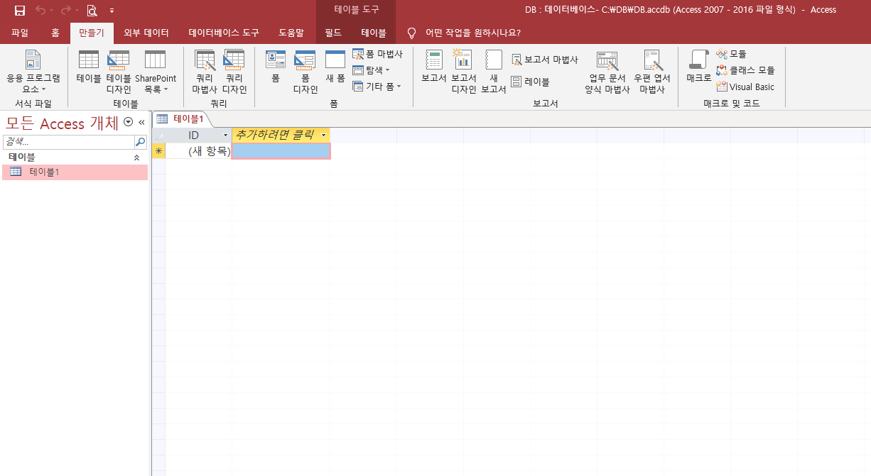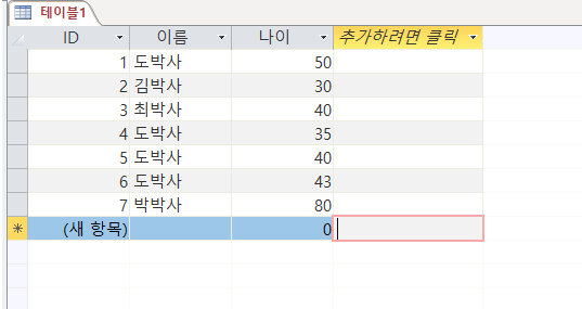 만들기 -> 테이블을 클릭하면 엑셀 시트같은 화면이 나타난다. 여기에 '추가하려면 클릭'을 눌러서 이름이나 나이 등 아무거나 데이터를 집어 넣도록 하자. 여기서 ID, 이름, 나이를 필드라고 부른다. 그 밑에 1, 도박사, 50 이것들은 레코드라 불리는 녀석들이다.