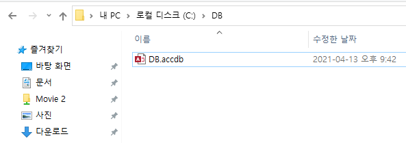 우선 연습용 액세스 DB를 만들어준다. 필자는 C드라이브에 DB 폴더를 만들고 그 안에 DB 파일을 생성하겠다.
