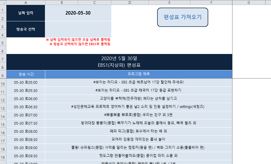 1. 편성표 출력할 날짜입력과 방송국 선택 (디폴트: 오늘 날짜, EBS1 선택)