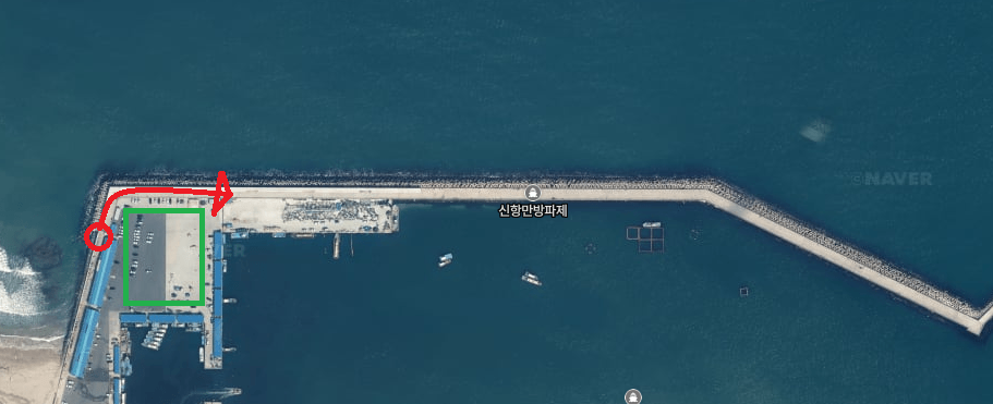 주차는 초록색 네모지역에 했고 입구는 빨간 원에서 부터 시작이다. 방파제가 워낙 높아서 담넘듯이 벽타고 올라가는건 불가능해보였다. 많은 사람들이 입구를 통해 왔다갔다 하고 있었다.