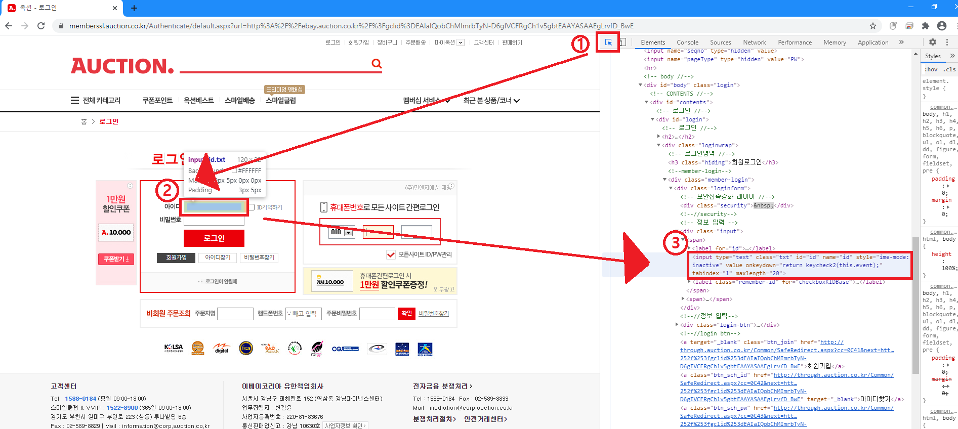 -> ③번 화면에서 옥션 아이디 입력하는 곳의 태그ID를 확인 할 수 있음(패스워드나, 로그인 버튼도 같은 방법으로 확인)