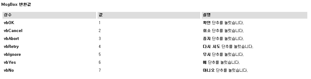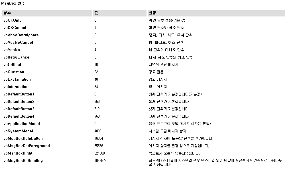vbOkCancel 대신 숫자 1을 넣어도 같은 동작을 한다.