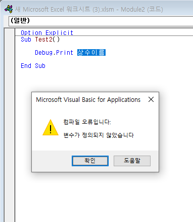 기본적으로 상수 선언을 하면 선언된 모듈 내에서만 사용 가능하며, 앞에 Public을 붙여준다면 모든 프로젝트에서 사용할 수 있게 된다. Public 없는 상태로 다른 모듈에서 상수를 호출하면 아무 일도 일어나지 않는다. 만약 Option Explicit 선언이 되어있다면 변수가 정의되지 않았다는 오류 팝업을 볼 수 있다.